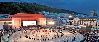春節(jié)假期,每到傍晚時(shí)分,四川省阿壩藏族羌族自治州若爾蓋縣城中心的北上廣場(chǎng)都會(huì)準(zhǔn)時(shí)響起歡快的鍋莊曲,遠(yuǎn)道而來的游客與當(dāng)?shù)厝罕娨黄鹛饸g快的鍋莊。伴著音樂,鮮艷的長袖在風(fēng)中劃出道道弧線,腰飾隨著舞步搖曳,男女老少圍成一圈、翩然起舞。