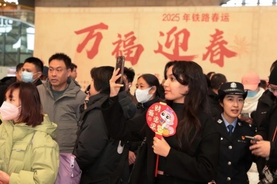 2025年鐵路春運“萬福迎春”活動現(xiàn)場,一位外籍旅客自拍留念。