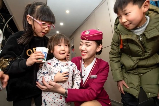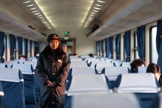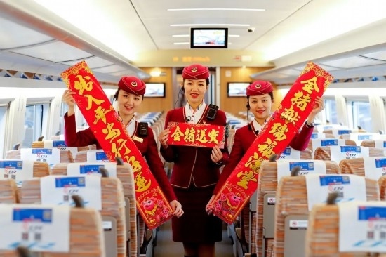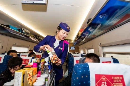 除夕當(dāng)天,復(fù)興號上的乘務(wù)員送出祝福。