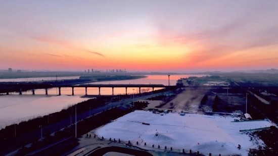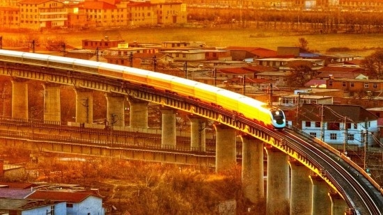 正月初五,兩趟高鐵列車在滹沱河上交會。