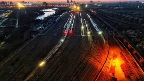 除夕當(dāng)天,石家莊動車運用所被金色的晨曦照亮。