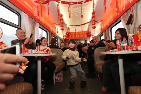 2月4日,臨客列車上的客運員與旅客一起聯(lián)歡。