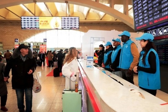 1月14日春運首日,外籍留學(xué)生志愿者走進石家莊站為旅客服務(wù)。