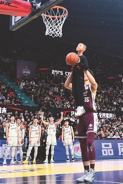 楊瀚森在活動中托舉吉林省孤兒學(xué)校的8歲男孩趙路?。ㄉ希?,幫助他完成扣籃。