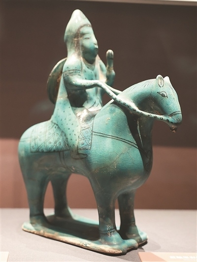 綠松石色釉小型樂(lè)隊(duì)模型為公元12—13世紀(jì)的作品,其結(jié)構(gòu)呈方形,表現(xiàn)了樂(lè)隊(duì)演奏或宴會(huì)場(chǎng)景,11名樂(lè)手分別演奏鐃鈸、鼓、琴、長(zhǎng)笛等樂(lè)器,場(chǎng)地中央置一果盤(pán)。藍(lán)釉黑彩騎士陶塑刻畫(huà)了具有東亞特征面孔的騎士形象。騎士頭戴尖頂帽,背負(fù)盾牌,其造型受到中國(guó)藝術(shù)的影響。
