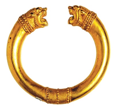 在古代伊朗文化中,環(huán)形因形似太陽(yáng),是密特拉信仰主神的象征,被賦予存在、原初、創(chuàng)世與永恒等含義。獨(dú)立展柜中陳列著一枚公元前2世紀(jì)的青銅授權(quán)環(huán)。授權(quán)環(huán)又稱“權(quán)力之環(huán)”,象征著權(quán)力的授予,授權(quán)時(shí)雙方各從一端握住它。展覽海報(bào)上的黃金獅首授權(quán)環(huán),為阿契美尼德王朝(公元前550年—公元前330年)的代表文物。