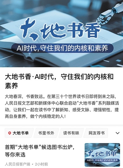 習(xí)近平總書記在今年全國兩會(huì)期間的重要講話中指出“書香是一種氛圍”“數(shù)字閱讀要和傳統(tǒng)閱讀結(jié)合起來,守住我們的內(nèi)核和素養(yǎng)”。在第三十個(gè)世界讀書日即將到來之際,人民日報(bào)社文藝部和新媒體中心聯(lián)合啟動(dòng)“大地書香”系列融媒活動(dòng),并圍繞“AI時(shí)代,守住我們的內(nèi)核和素養(yǎng)”推出首期“大地書單”。來自出版、文藝、科技、教育等不同領(lǐng)域的20位薦書人,推薦出35本候選圖書,在人民日報(bào)客戶端“大地書香”專題予以集中呈現(xiàn),參照網(wǎng)友的評論與推薦,最終推選出10本上榜圖書。讓我們多讀書、讀好書,一起在氤氳著書香的大地上行穩(wěn)致遠(yuǎn)。