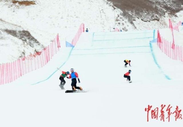2月20日,單板滑雪公開組障礙追逐混合團體賽中,貴州隊王會楊率先沖過終點。中青報·中青網(wǎng)記者 石佳/攝