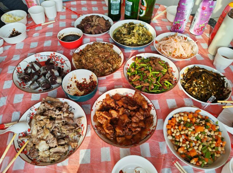 忙活了一上午,紅白相間的桌布上各類菜品早已擺得滿滿當當,除了位居主位的殺豬菜,還多了許多“衍生作品”:醬燜肉、汆白肉、蒜苔炒肉、酸菜炒肉、涼拌豬肝、豬血腸、涼拌海帶條、芥菜絲……圍坐一圈的不止家人,還有左鄰右舍。無需主人過多招呼,筷子便紛紛探向鍋中。窗外寒風漸歇,霧氣也被陽光驅散,而在溫暖的屋子里,鍋氣蒸騰,模糊了窗上的冰花,也潤濕了每一雙帶著笑意的眼睛。這不僅僅是一頓飯,更是鄉(xiāng)里鄉(xiāng)親們對生活最熱烈的擁抱?! ?/p>