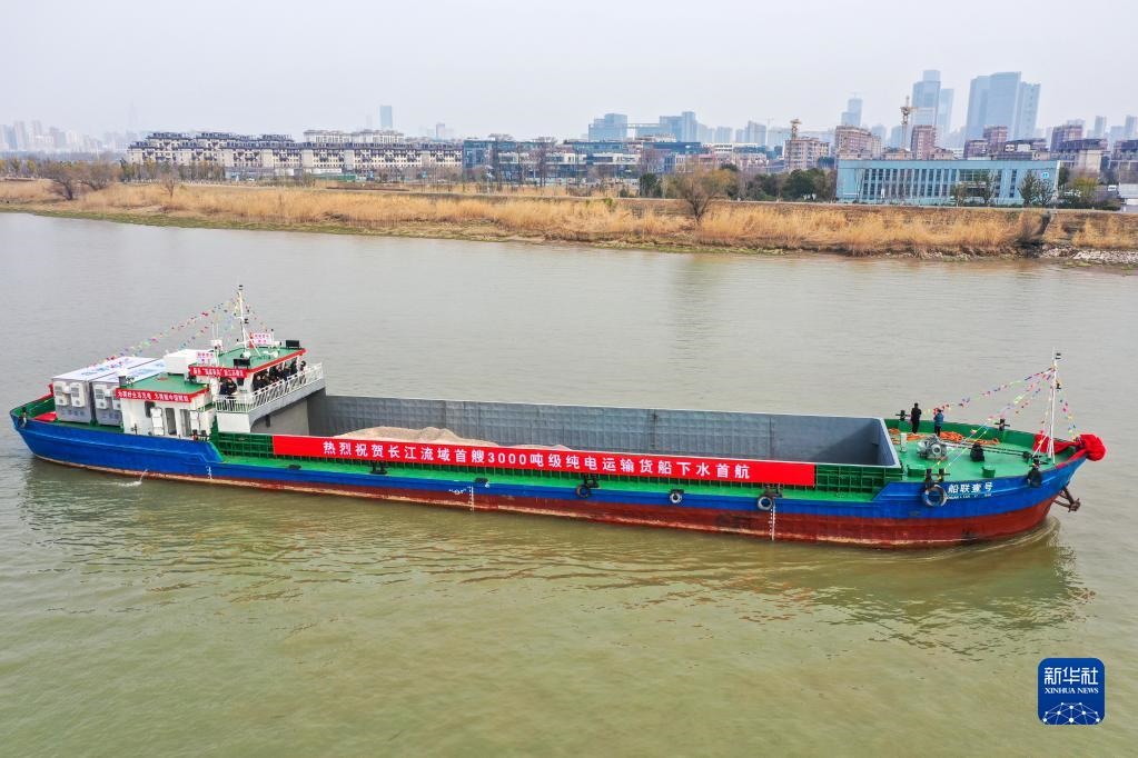 “船聯(lián)1號(hào)”電動(dòng)貨船在長江南京段航行(2月22日攝,無人機(jī)照片)。