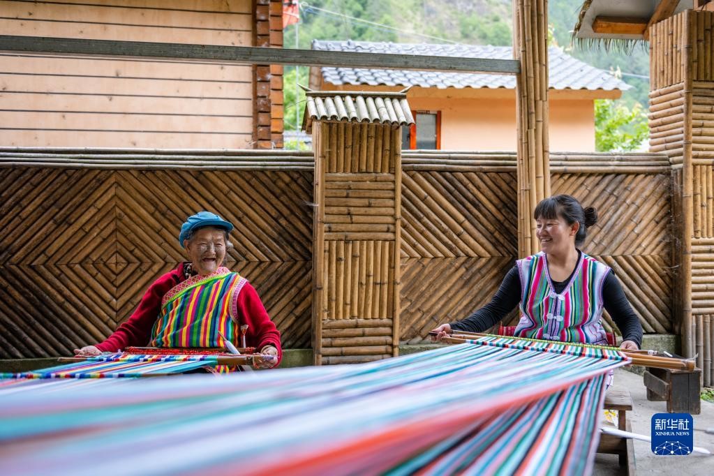 在云南省貢山獨龍族怒族自治縣獨龍江鄉(xiāng)迪政當(dāng)村,獨龍族老人李文仕(左)和女兒在編織獨龍?zhí)?5月10日攝)。新華社記者 曹夢瑤 攝